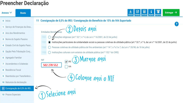 É muito fácil. Quando preencher a sua declaração de IRS (em papel ou on-line) deve colocar no Campo 1101 do Quadro 11 do Modelo 3 – Rosto uma cruz em “Instituições Particulares de S. Social …” e introduzir o NIF da Fundação Creche Helena Albuquerque Quadros – 502 278 552 e colocar um X em IRS.